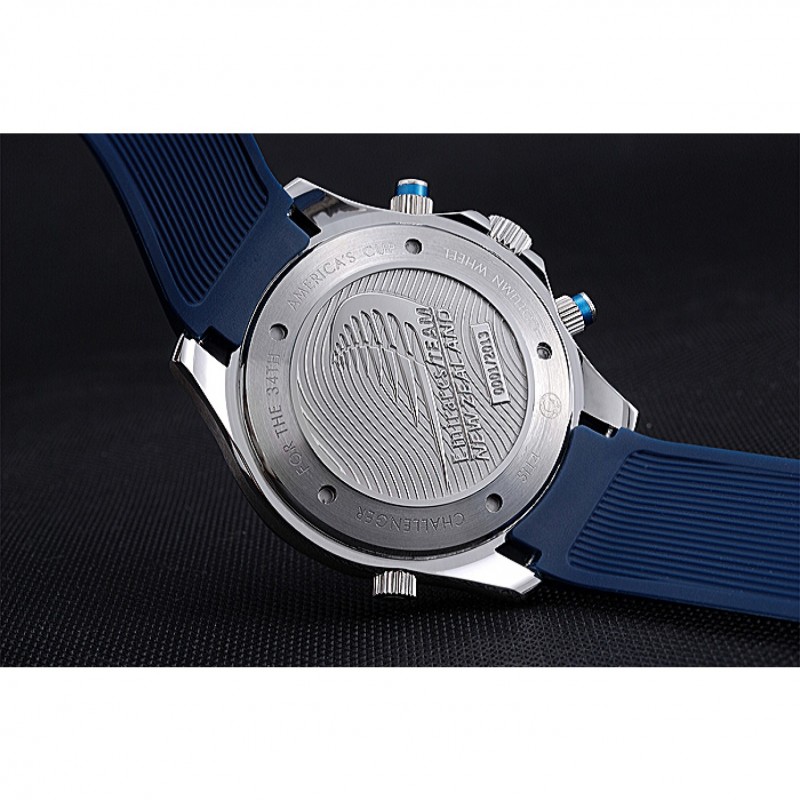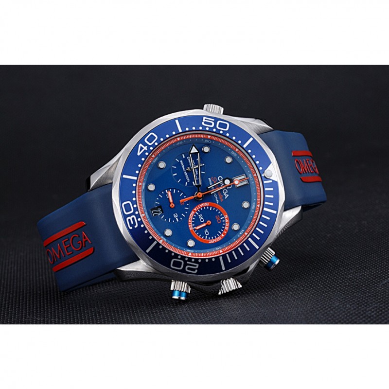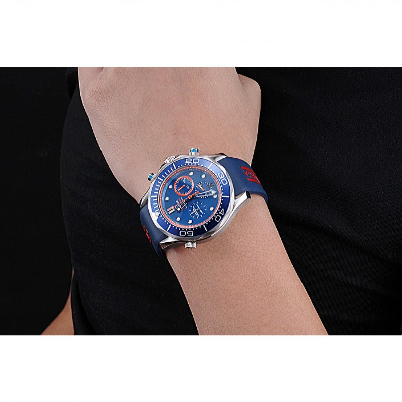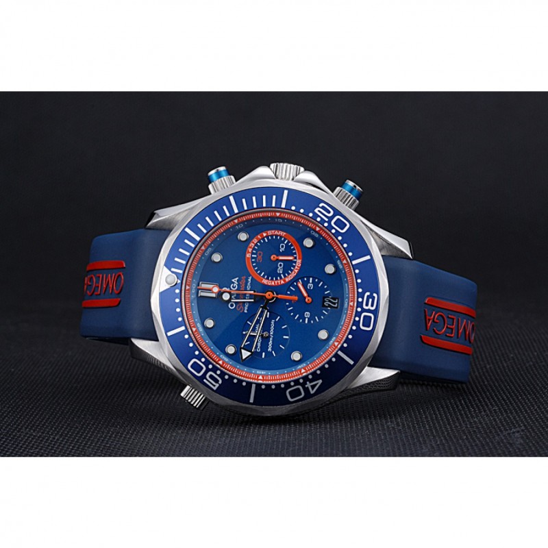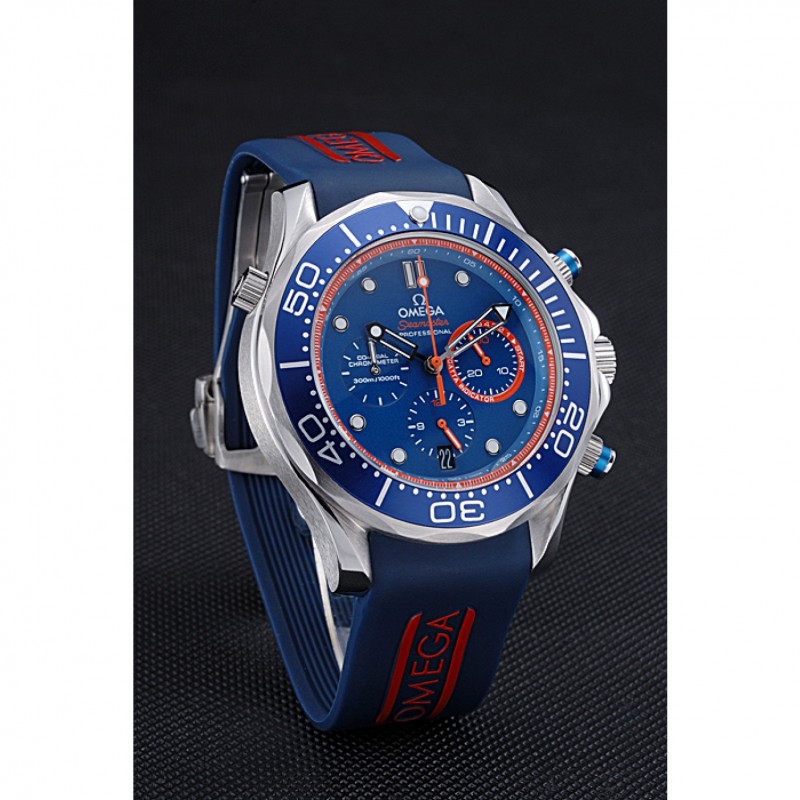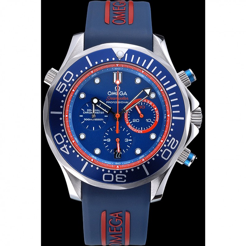 Crown: logo Omega grabado pulido corona cutwork de acero inoxidable con azul tira de esmalte pulsador ronda corona en cada lado de ella, más un logo grabado pulido corona cutwork de acero inoxidable en la esquina superior opuesta